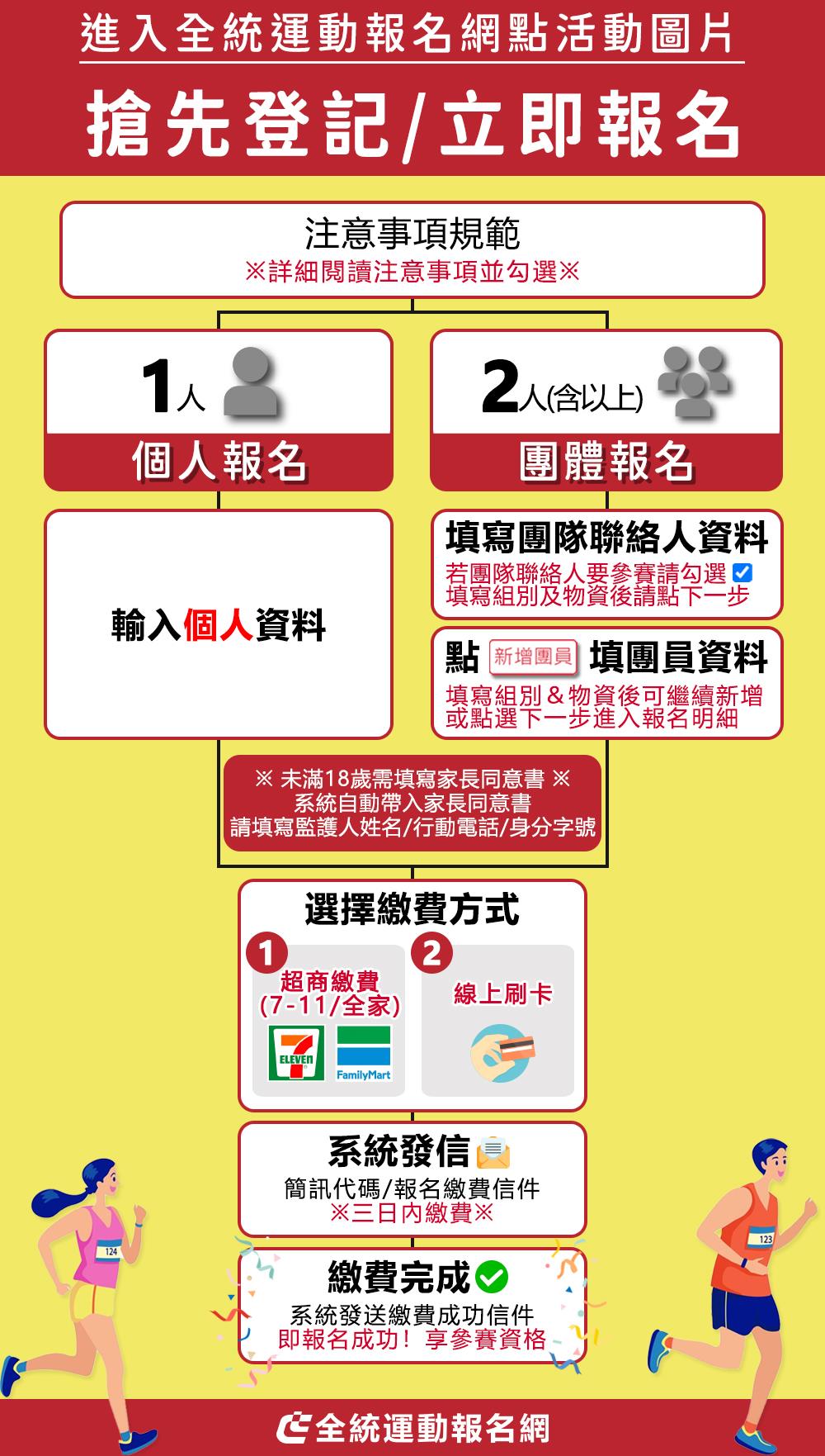 6歲以下兒童需與18歲以上成人同時報名參賽, 未滿18歲選手報名請填寫線上「家長同意書」