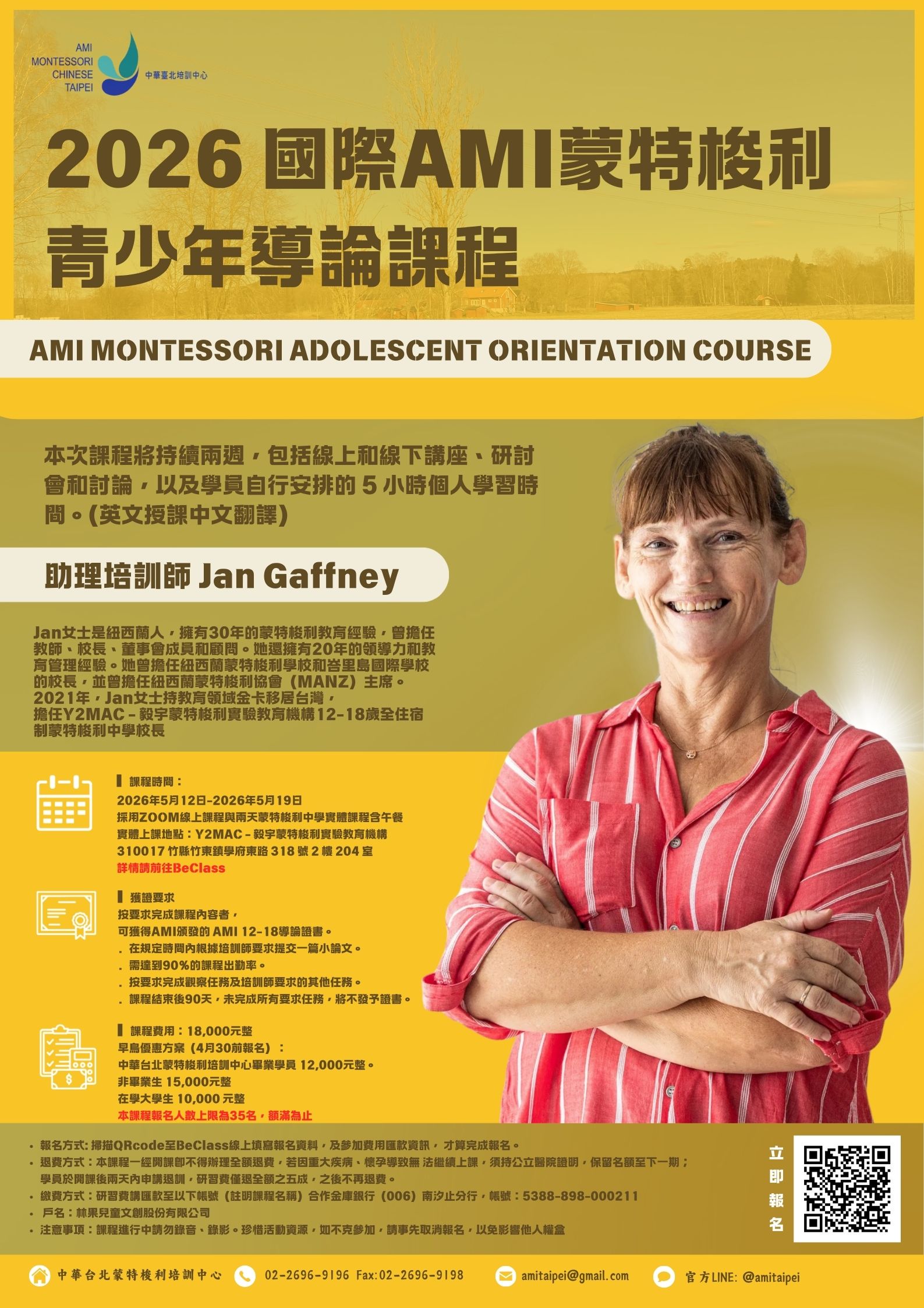 國際AMI蒙特梭利 青少年 導論課程AMI Montessori Adolescent Orientation Course英文授課,中文翻譯l 助理培訓師介紹 培訓師 Jan Gaffney Jan女士是紐西蘭人,擁有30年的蒙特梭利教育經驗,曾擔任教師、校長、董事會成員和顧問。她還擁有20年的領導力和教育管理經驗。她曾擔任紐西蘭蒙特梭利學校和峇裡島國際學校的校長,並曾擔任紐西蘭蒙特梭利協會(MANZ)主席。 2021年,Jan女士持教育領域金卡移居臺灣,擔任Y2MAC - 毅宇蒙特梭利實驗教育機構12-18歲全住宿制蒙特梭利中學校長l 課程時間2026年5月12日-2026年5月192026 國際AMI 蒙特梭利 青少年導論課程活動日期:2026-05-12 /think