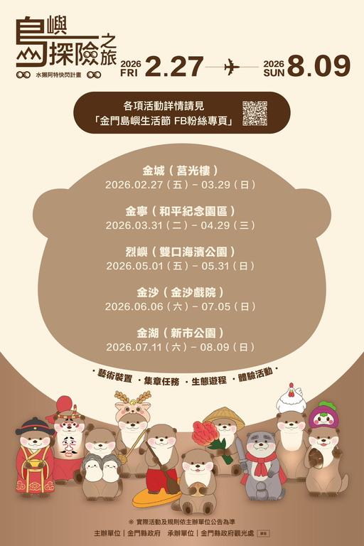 水獺阿特快閃計畫:島嶼探險之旅,由金門觀光處邀請日本藝術家 Akane 聯手打造,以水獺意象為核心,於金門五鄉鎮巡迴展出 10 款風格各異的「阿特」造型,展現島嶼風景、人文故事與地方魅力。活動從 2026 年 2 月 14 日起,持續至 8 月 9 日,每一站皆有不同主題與限定驚喜,適合親子、好友及拍照打卡控參與。