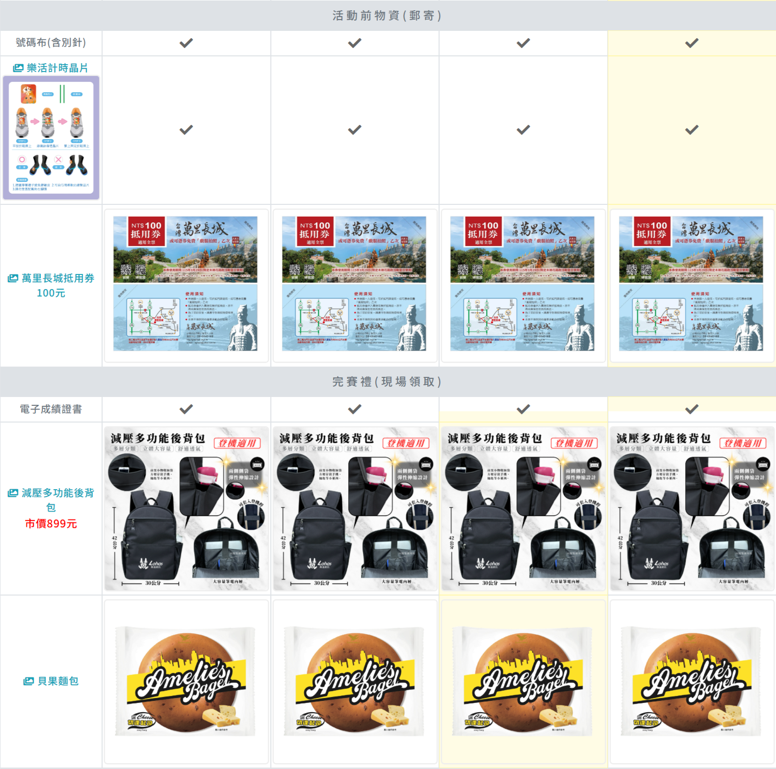 - 參賽贈品:號碼布(含別針)、樂活計時晶片、萬里長城抵用券100元、完賽獎牌、電子成績證書、減壓多功能後揹包、貝果麵包